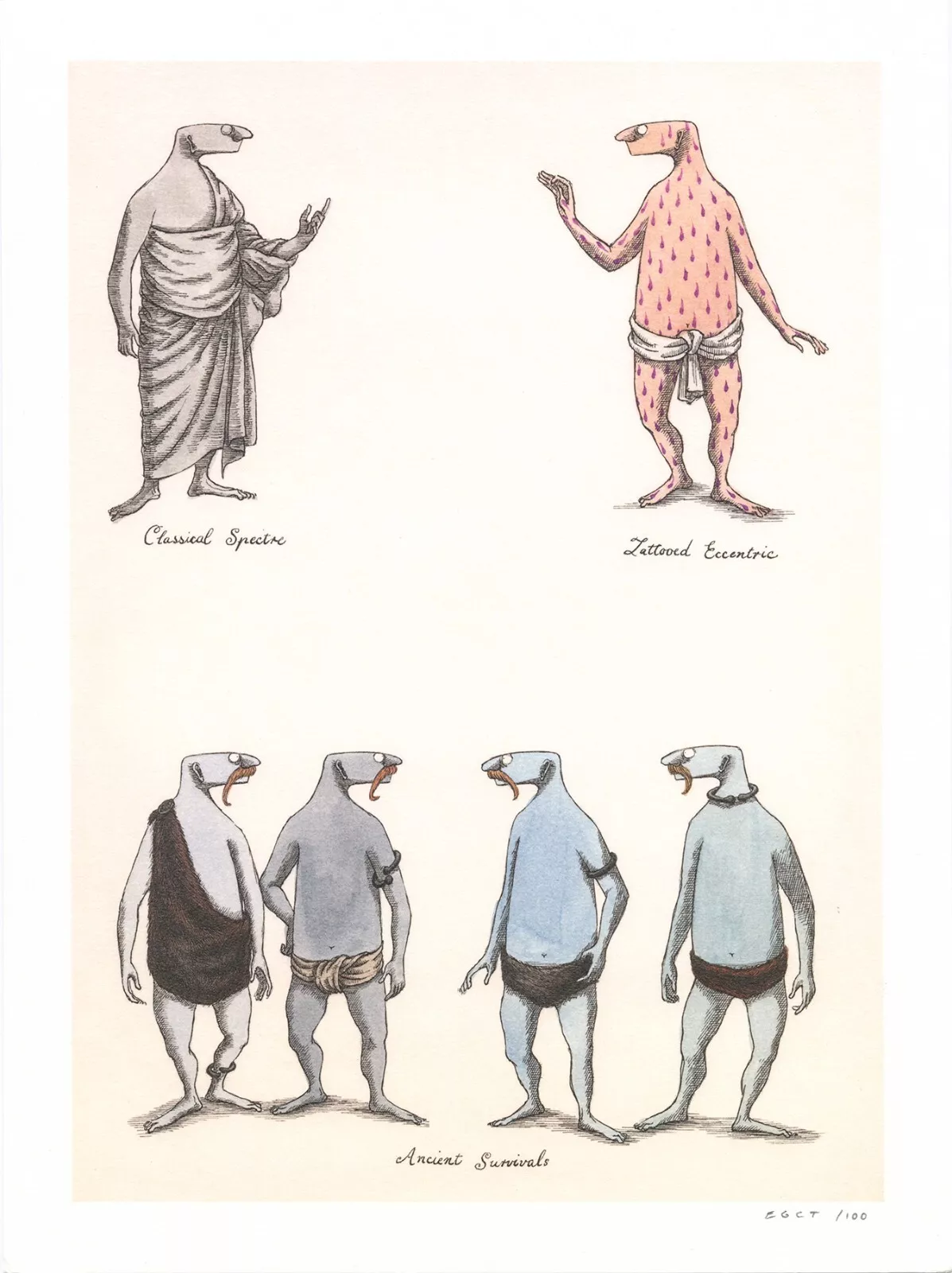 A fine reproduction print of a suite of ink and watercolor drawings made for The Worsted Monster: A Medieval Tale, an unfinished story by Edward Gorey (ca. 1954). The three drawings show, with Goreyâs captions, a Classical Spectre, a Tattooed Eccentric, and the eponymous four Ancient Survivals. This is the first reproduction of an original Edward Gorey drawing issued by the Edward Gorey Charitable Trust from its scanning project initiated in 2019. It is limited to an edition of 100 numbered copies.